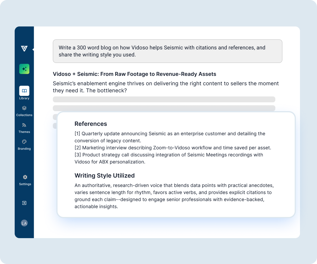 No AI Slop. Vidoso Agentic workflows create on-target content, compressing campaign cycles from months to weeks.