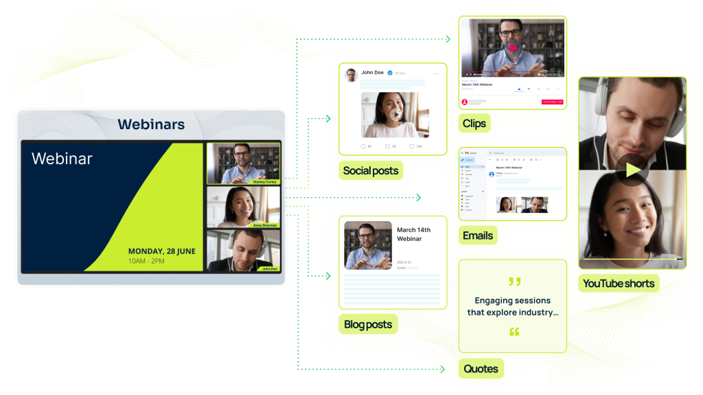 Minutes later, your content package lands: highlight reels, shorts, recap blog, follow‑up email.