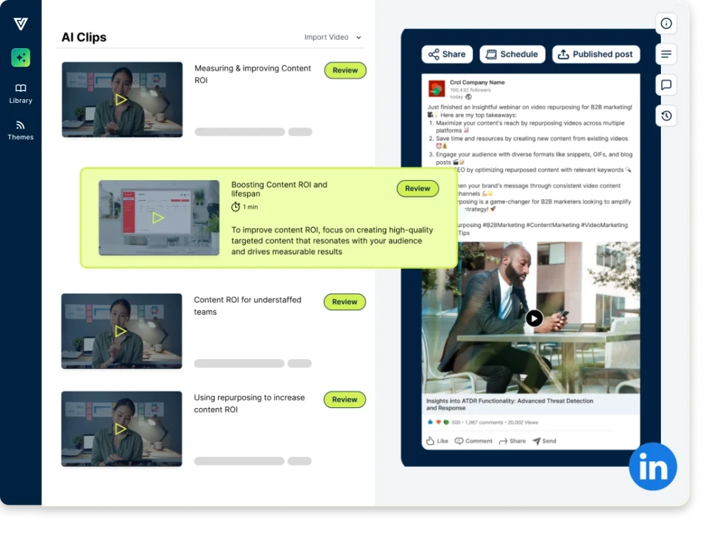 - AI organizes your clips by themes, so you can reuse them faster