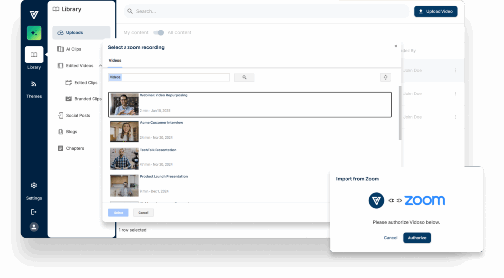 Pull your zoom recordings and webinars into Vidoso with a click.